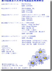 | 東京大学音楽部コールアカデミー | 『ルネッサンス合唱曲集』 Isbruck, ich muss dich lassen(インスブルックよ,さようなら) Il estoit une fillette(恋の手習い) Panis Angelicvs(天使のパン) Mignonne, allons voir si la rose(美しき人,バラを愛でん) Cantata Domino(主に向かって唱え) 【指揮】津山重雄 |