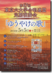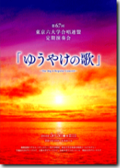六大学合同演奏ステージ | 男声合唱とピアノのための「ゆうやけの歌」 ゆうやけの歌 【作曲】湯山 昭 【作詞】川崎 洋 【指揮】上西一郎 【ピアノ】平林知子 |
