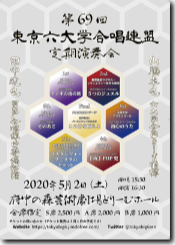 5月2日(土)に府中の森芸術劇場どり-むホールで開催予定でした、東京六大学合唱連盟(以下、六連)第69回定期演奏会は、先日新型肺炎感染拡大の影響により延期を発表Lておりましたが、その後六連理事内で協議を重ねた結果、延期先の詳細が決定いたしましたので、ご報告させていただきます。