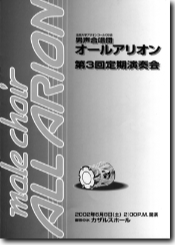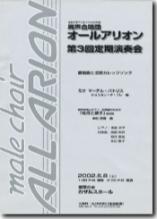 愛唱曲と法政カレッジソング集【賛助出演】法政大学アリオンコール有志 | 愛唱曲 野ばら 【作曲】ウエルナーi いざ起て戦人よ 【作曲】グラナハム Städchen 【作曲】マルシュネル Sailing, Sailin 【作曲】シー・シャンティ R.ワグナー Aura Lee 【作曲】G.R.プールトン ともしび ロシア民謡 【訳詩】楽団カチューシャ 【編曲】田中信昭 ふるさとの 【作詞】石川啄木 【作曲】庄司光郎 【補作】篠田守弘 秋のピエロ(組曲「月光とピエロ」より) 【作詞】堀口大学 【作曲】清水 脩 合唱のためのコンポジション第6番第1楽章 【作曲】間宮芳生 カレッジソング集 法政大学学生歌「オレンジの園に」 【作詞】勝 承夫 【作曲】平井康三郎 【編曲】阿部治男 【補作】田中信昭 法政大学応援歌「若き日の誇り」 【作詞】法政大学応援団 【作曲】岡本雅雄 【編曲】オールアリオン 法政大学学生歌「青春の烽火」 【作詞】勝 承夫 【作曲】平井康三郎 【編曲】庄司光郎・篠田守弘 法政大学応援歌「暁の勇者」 【作詞・作曲】高橋俊夫 【編曲】オールアリオン 法政大学校歌 【作詞】佐藤春夫 【作曲】近衛秀麿 【編曲】田中信昭 【指揮】根本隆雄、井口 亨、庄司光郎、茂手木裕二 |
