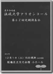 | 二群の男声合唱とピアノのための「路標のうた」 | 1986年度法関合同委嘱作品 《現役OB合同演奏》 【作詩】木島 始 【作曲】三善 晃 【指揮】田中信昭 【ピアノ】中嶋 香 |